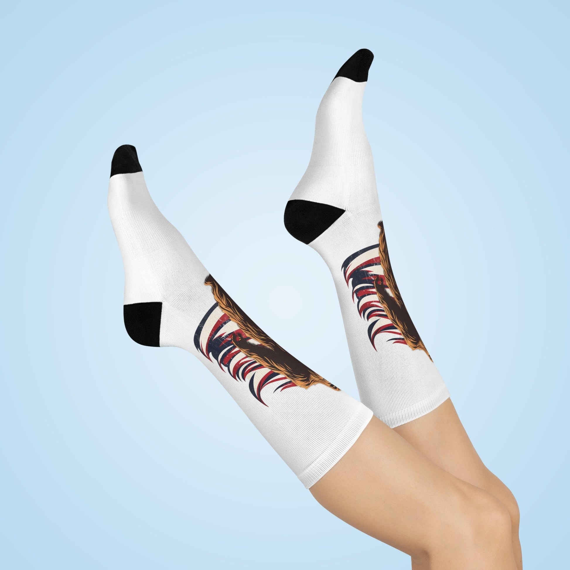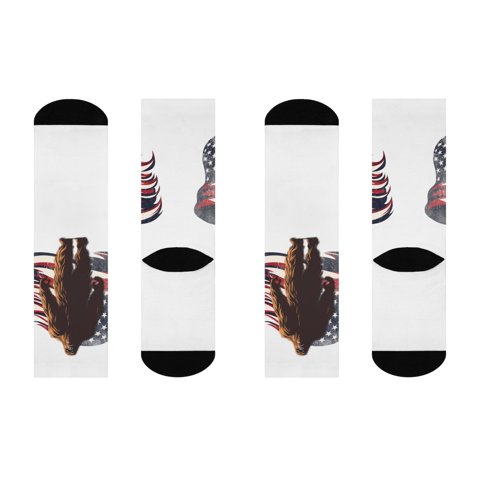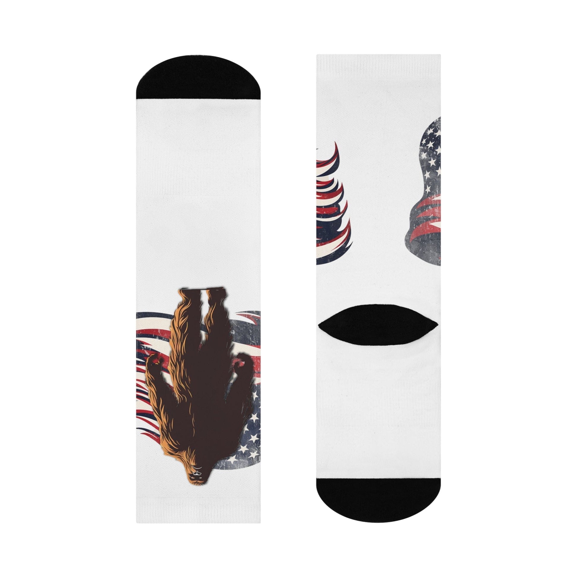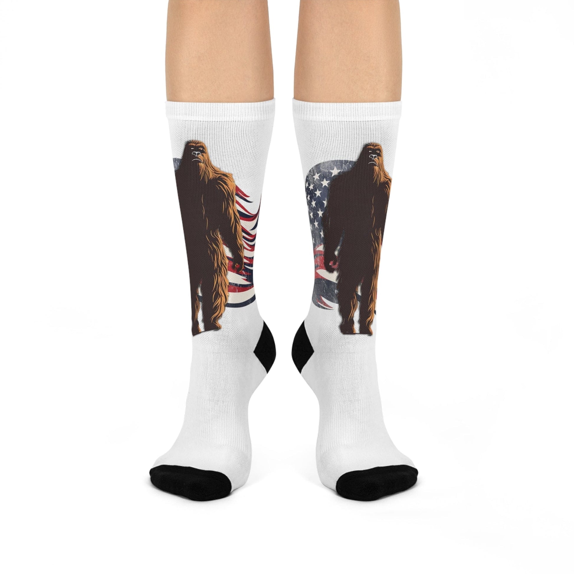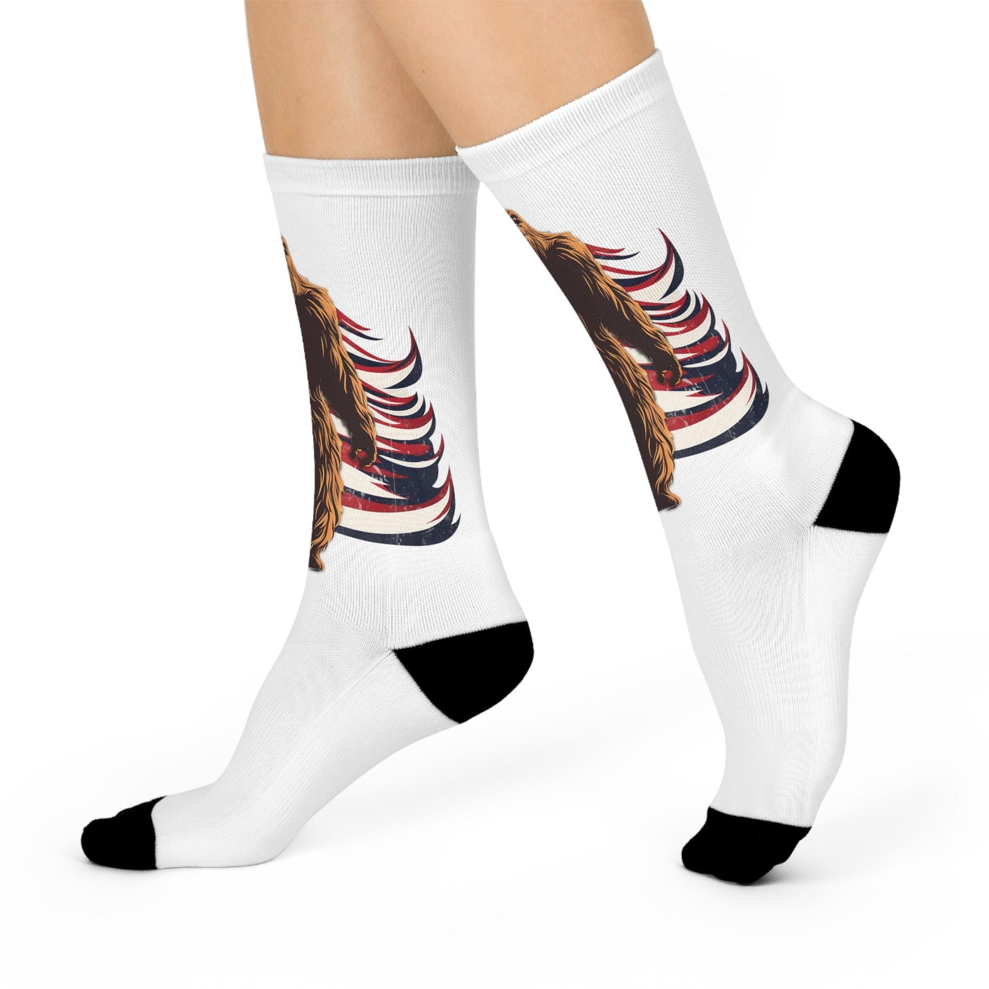 Step into the world of American folklore with these cushioned crew socks featuring a Bigfoot design. These socks offer both comfort and style, with a fully cushioned heel-to-toe and a blend of materials for the perfect fit. The image on the socks showcases a Bigfoot figure against a backdrop of the American flag, combining mythical charm with patriotic flair.
