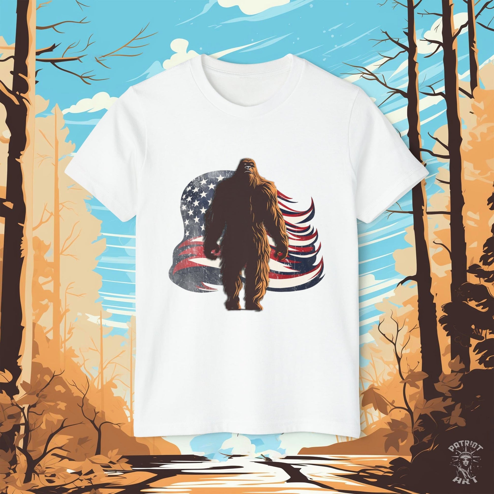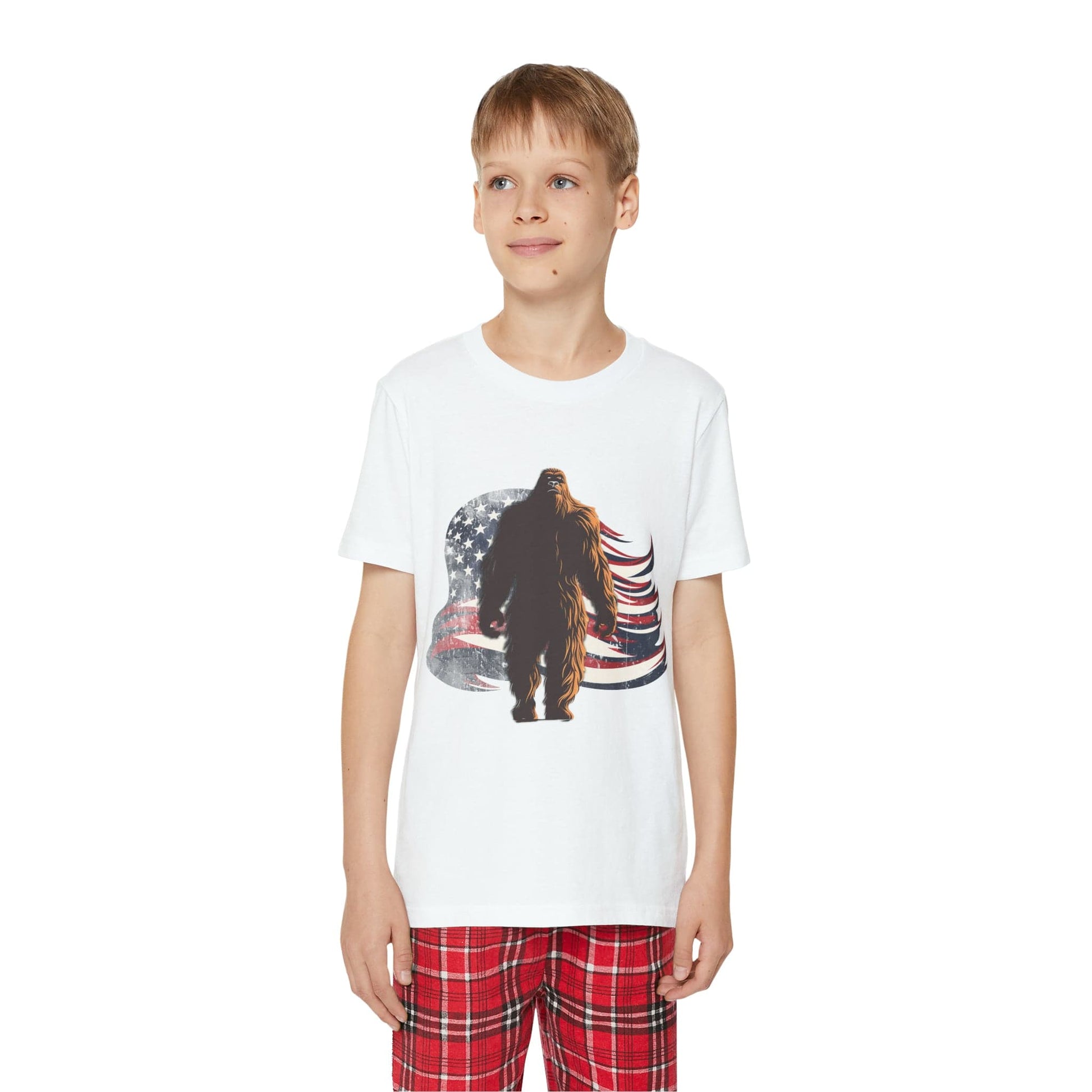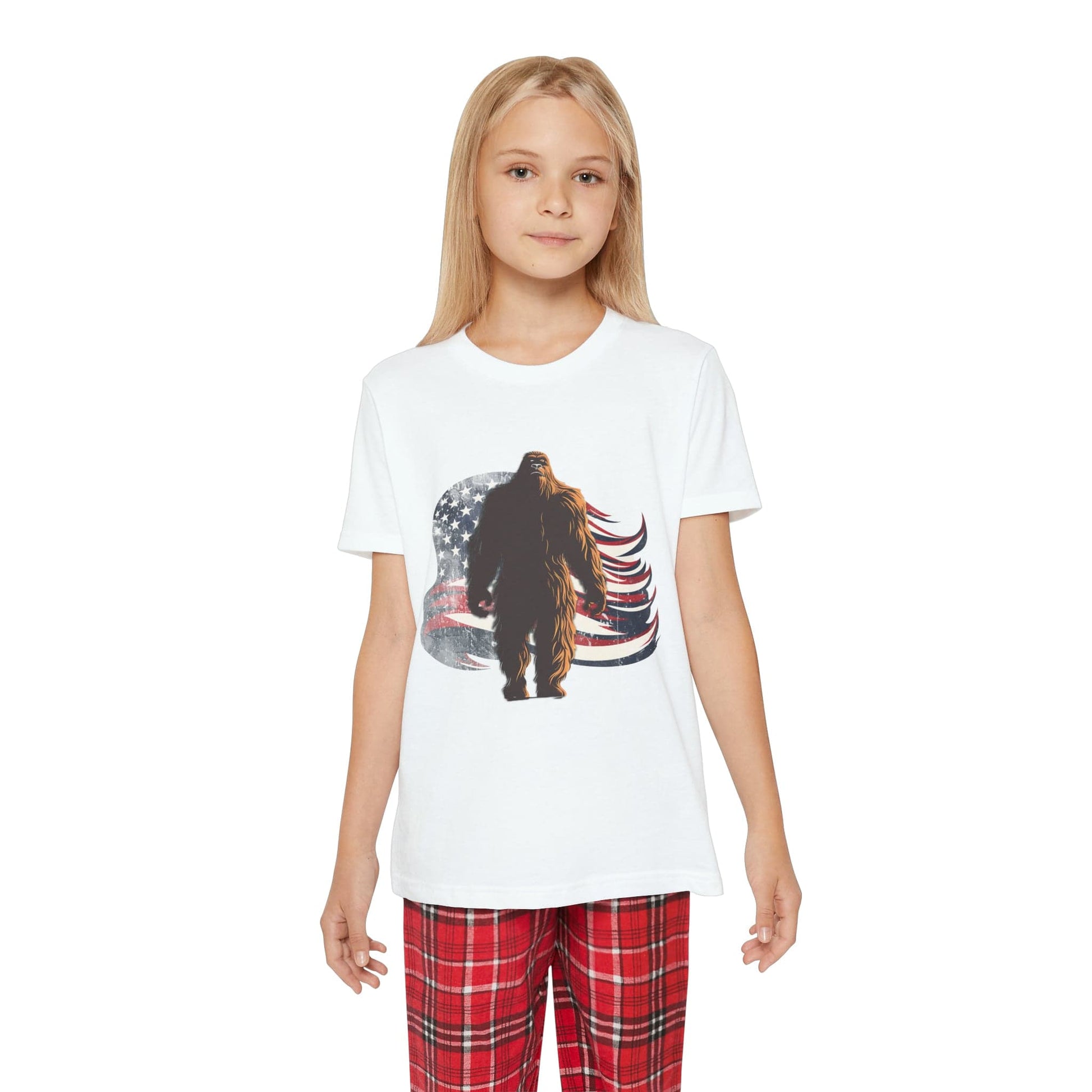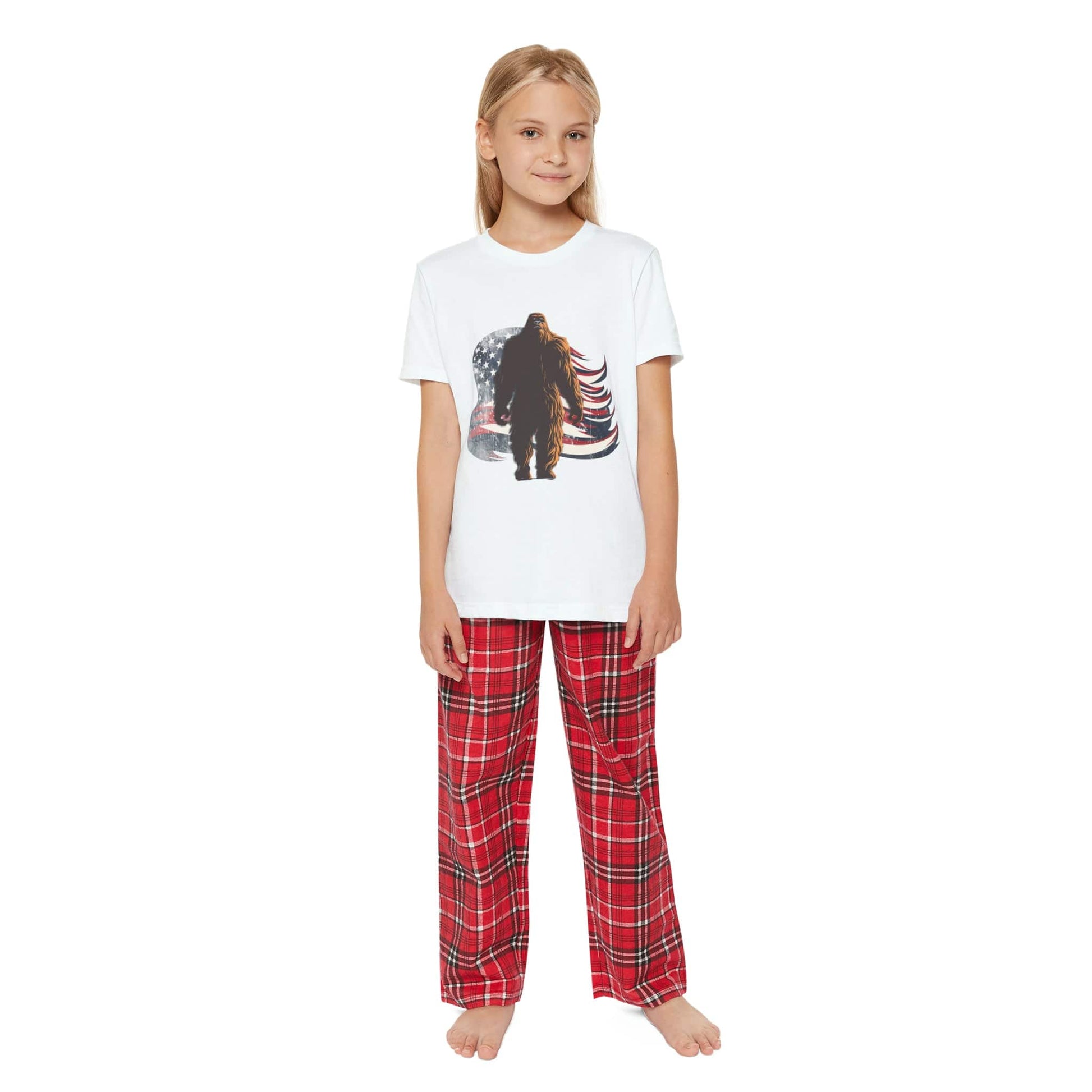 Elevate your child's bedtime comfort with this short-sleeved outfit set, crafted from 100% cozy cotton. Its elastic waistband and straight legs ensure a snug fit. The design features a figure reminiscent of Bigfoot or Sasquatch, a creature from American folklore. This upright silhouette showcases long, shaggy hair, a prominent brow, and a beard, all with a patriotic backdrop of the American flag's stars and stripes. Please note that the garment is not flame-resistant and should fit snugly for safety.