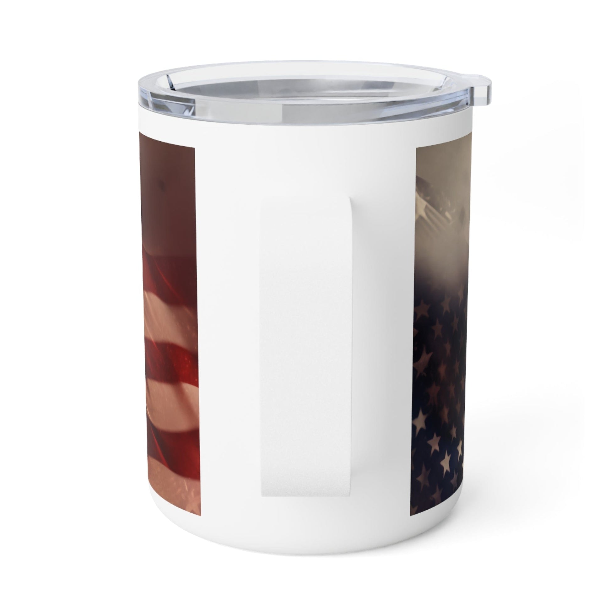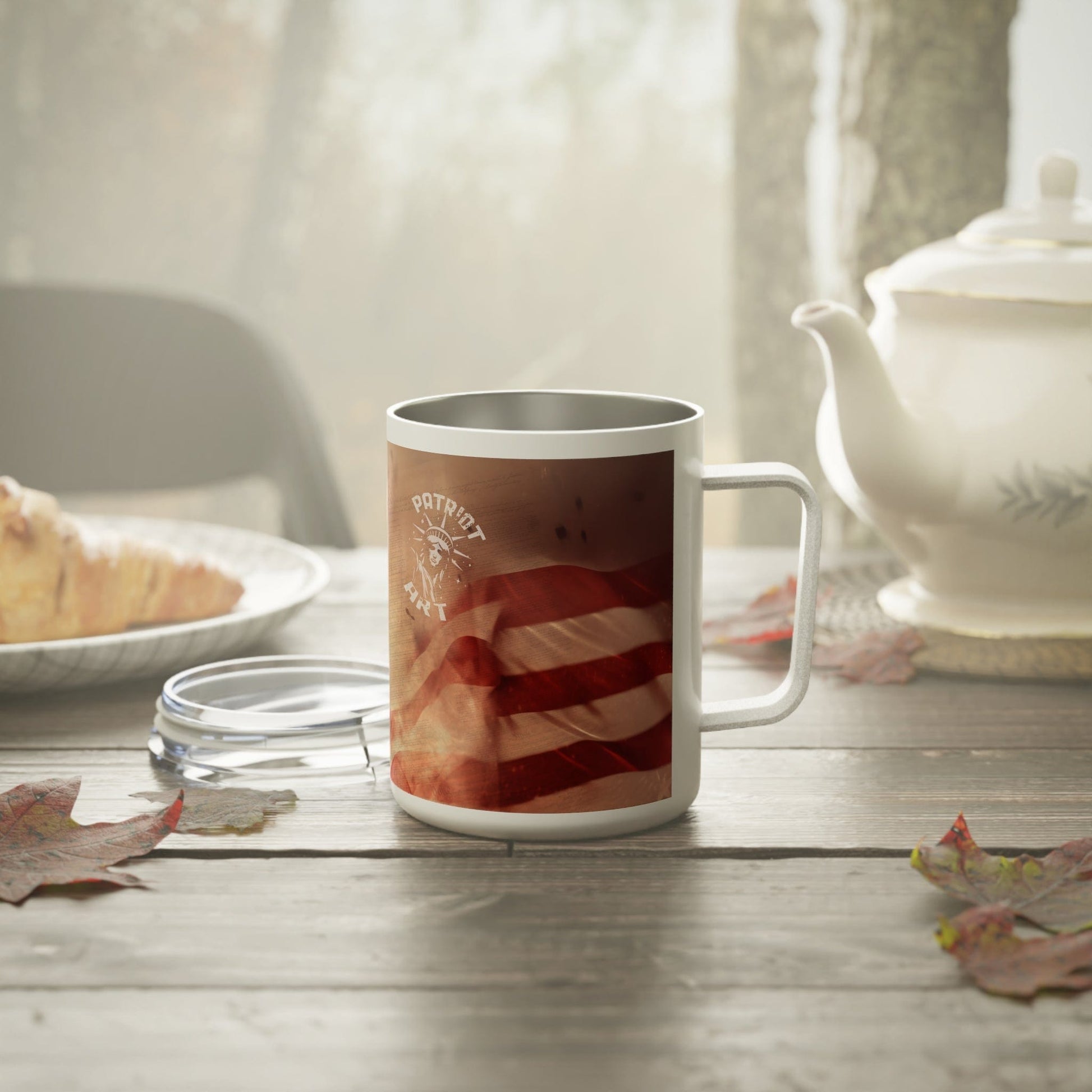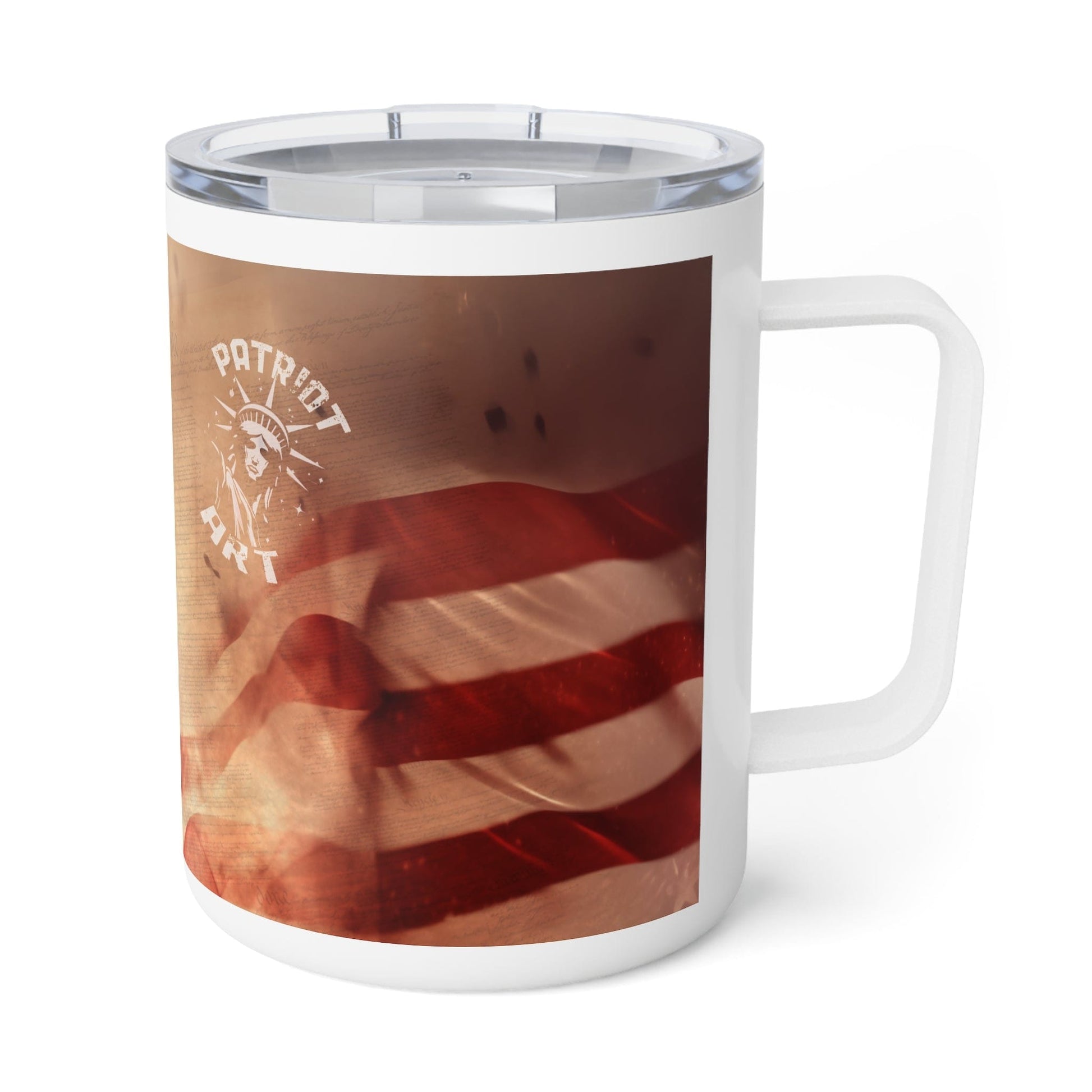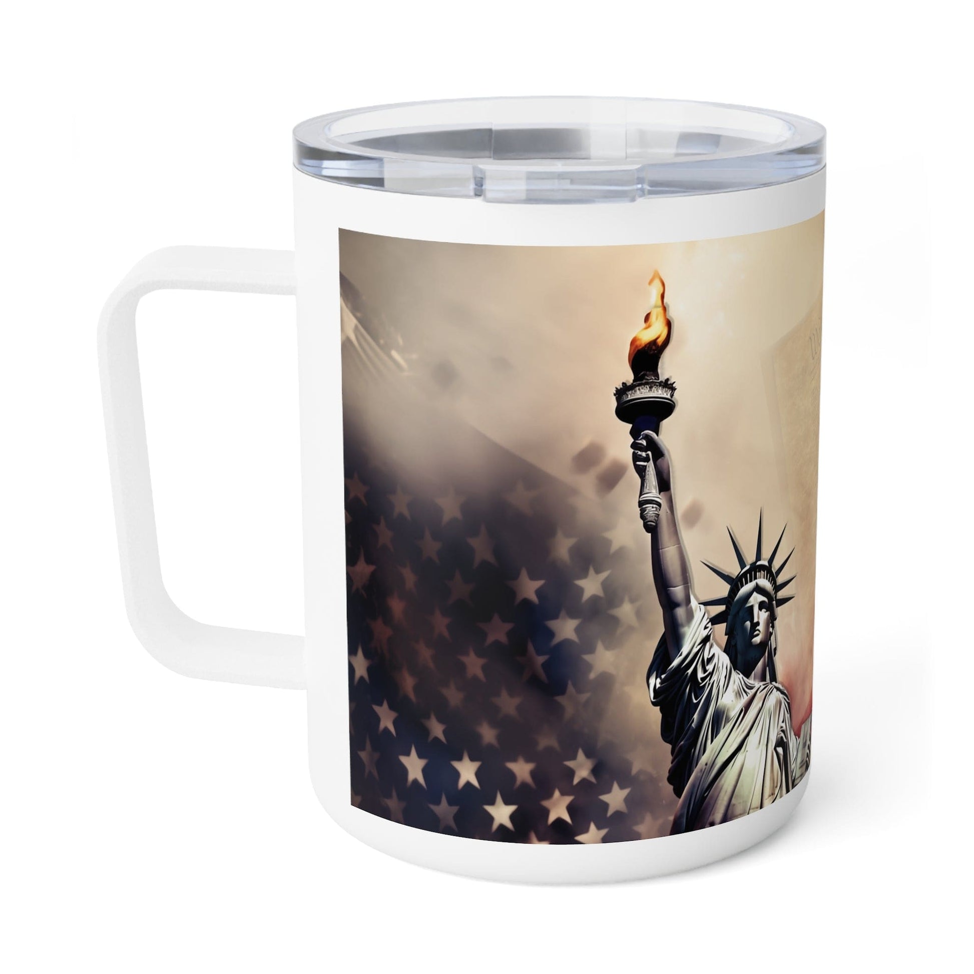 Freedom in Every Sip Infuse your mornings with patriotism. This insulated mug features iconic symbols of American freedom: the Statue of Liberty, the American flag, and the Declaration of Independence.