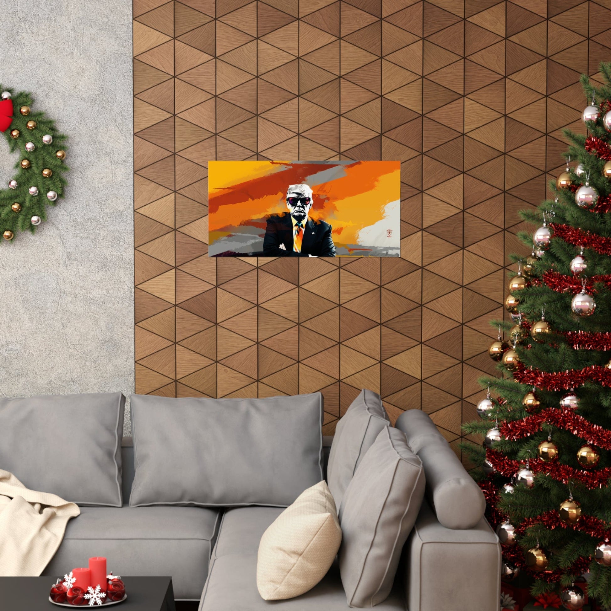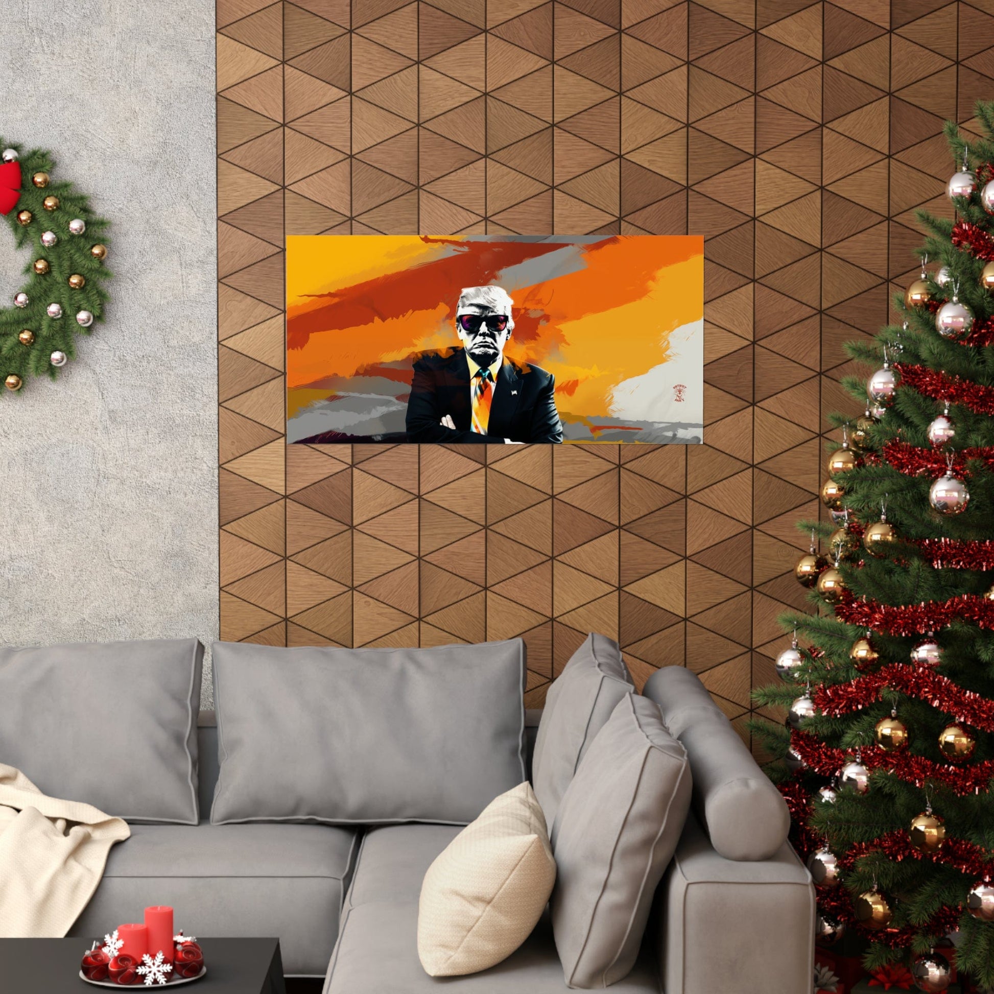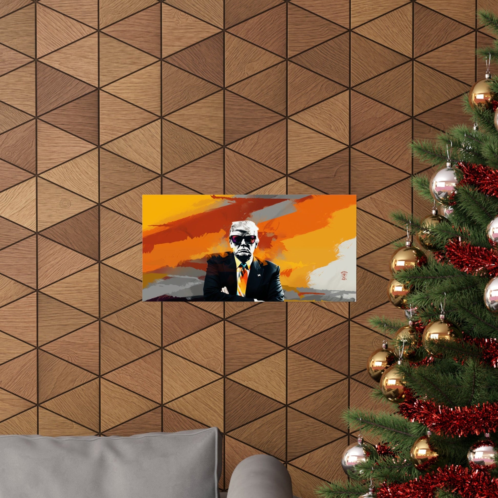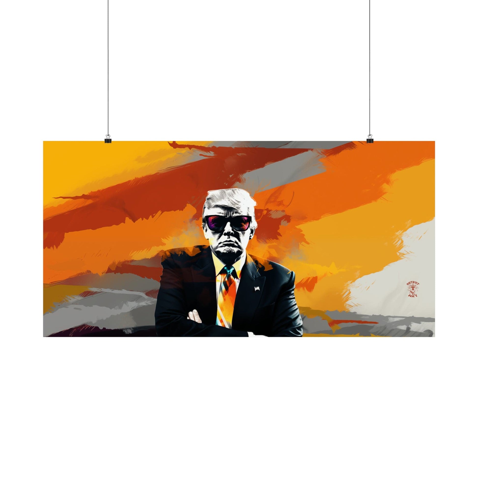 Discover the visual dynamism of "Trump Shades 3 of 4" from our Pop Art Series. This piece captures The Don in a moment of confidence, accentuated by his iconic shades. The backdrop is a dramatic burst of vibrant colors, symbolizing a fusion of creativity and political pop art. This poster is not just a piece of art; it's a statement of the bold spirit of conservatism, where human creativity meets AI innovation.
