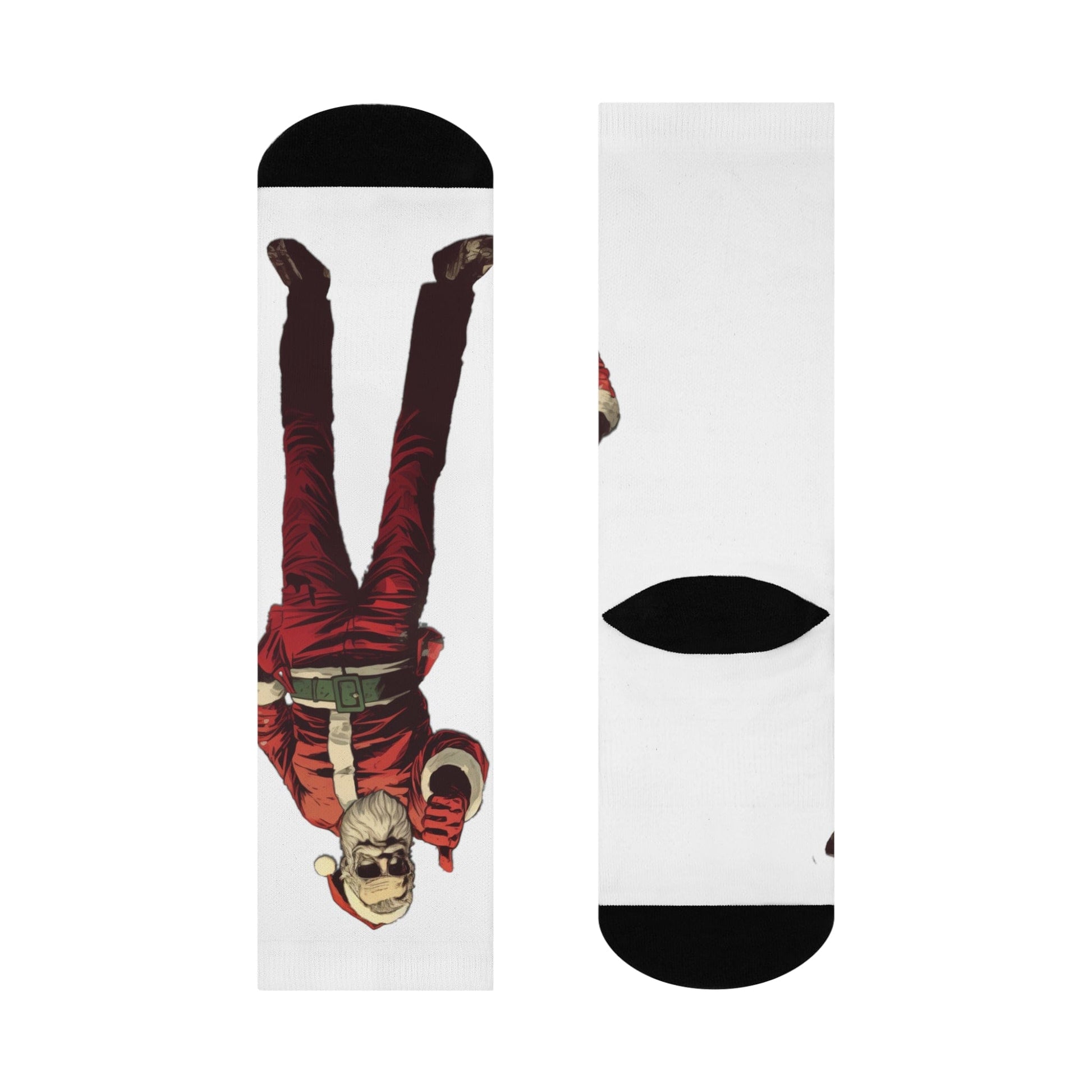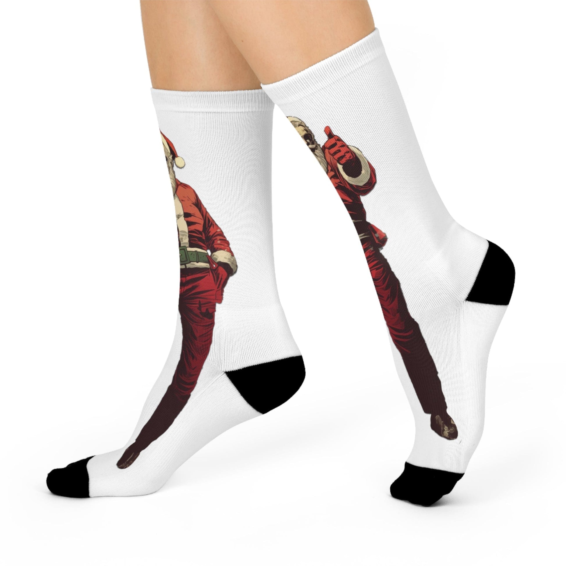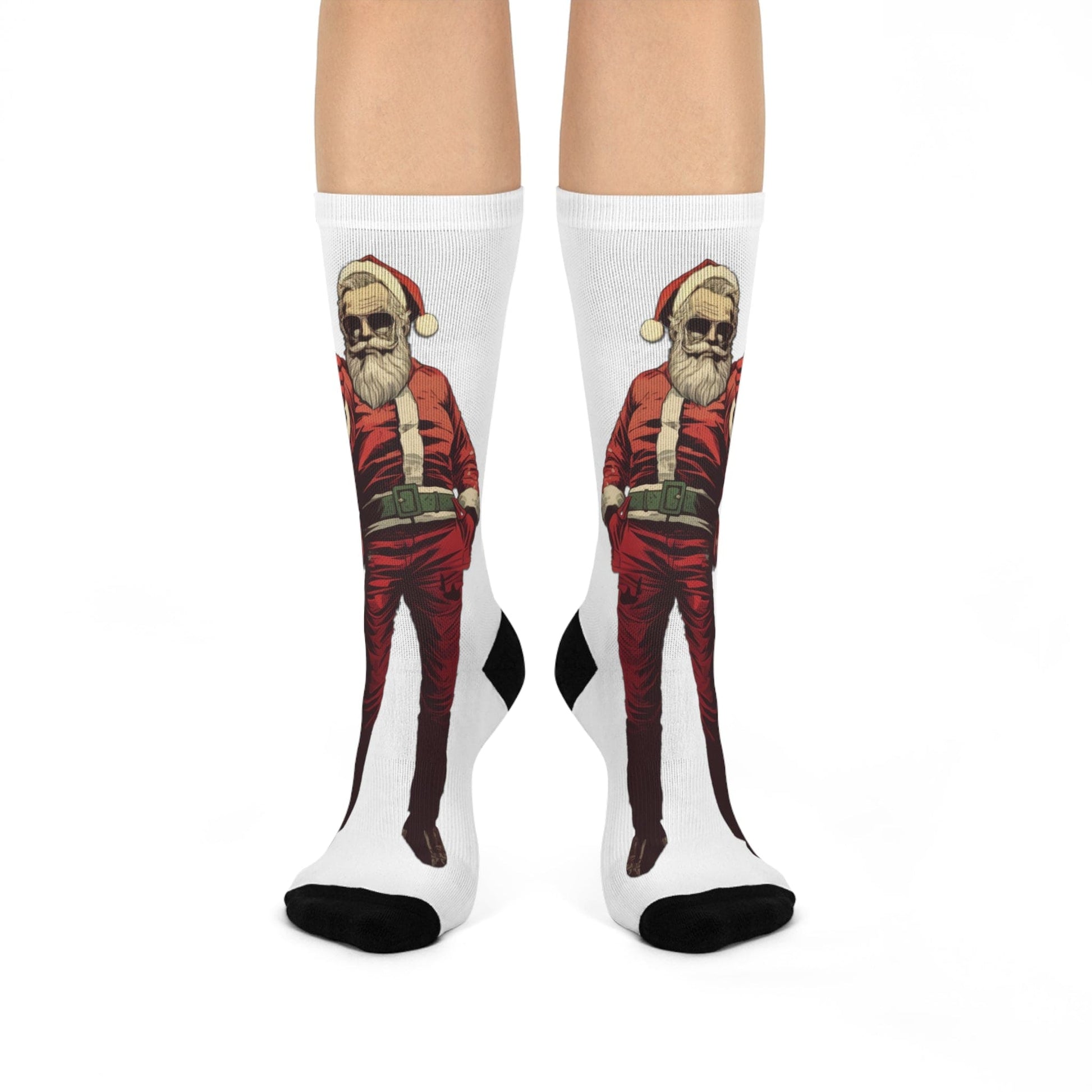 Step into comfort and style with these cushioned crew socks designed for both function and appearance. Made with a blend of materials for a cozy fit, these socks feature cushioned bottoms for superior comfort. The image showcases a modern and stylized Santa Claus giving a thumbs-up gesture, dressed in his traditional attire with a contemporary twist, including sunglasses for added coolness. Perfect for those who want to celebrate the holidays with a touch of modern flair and a positive vibe.