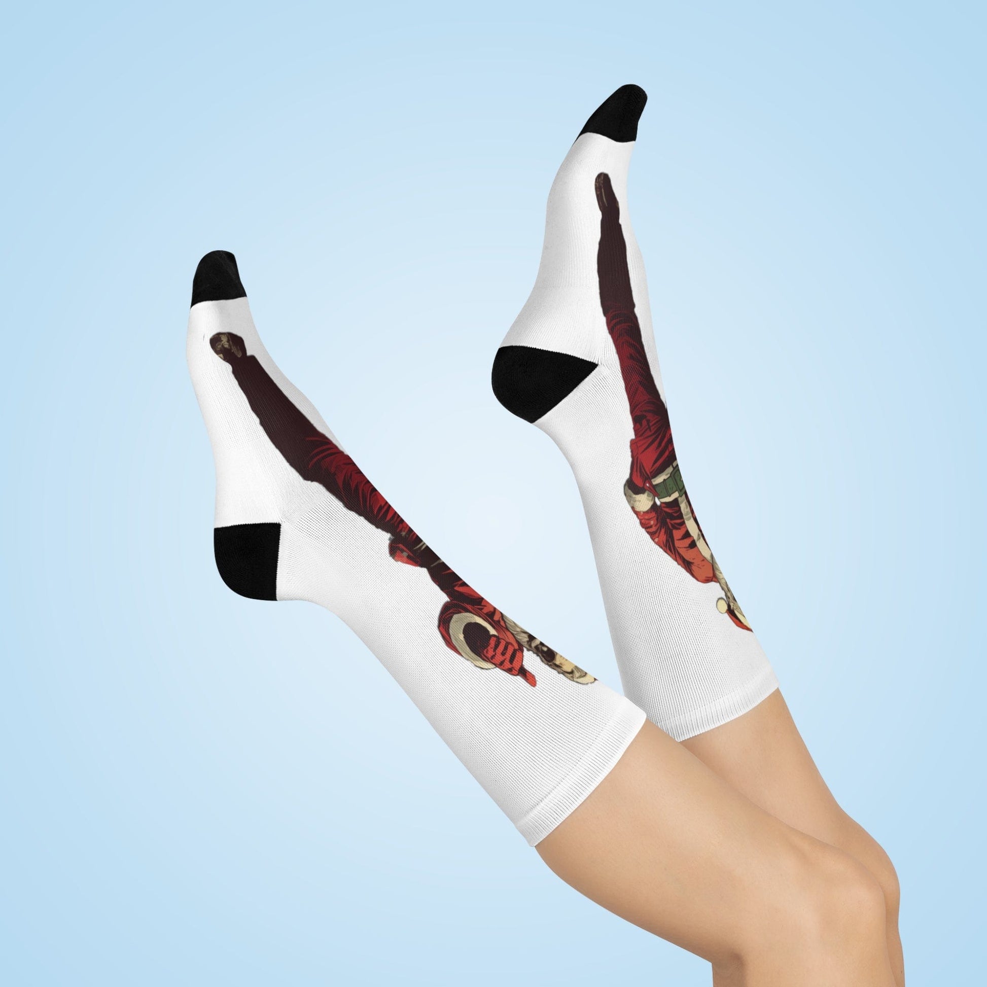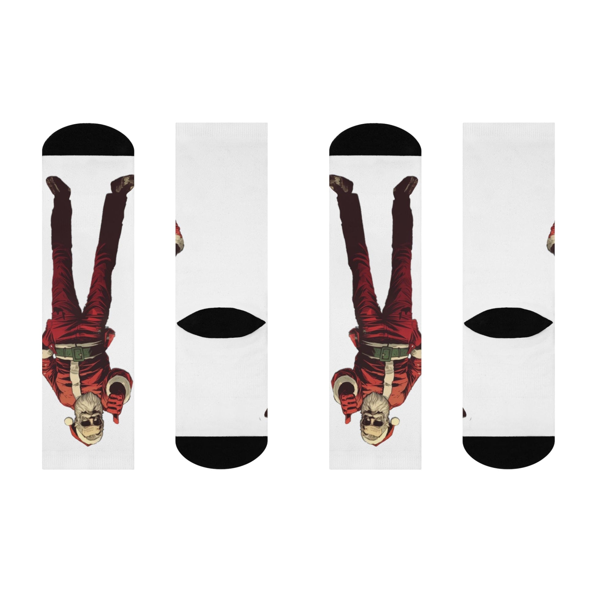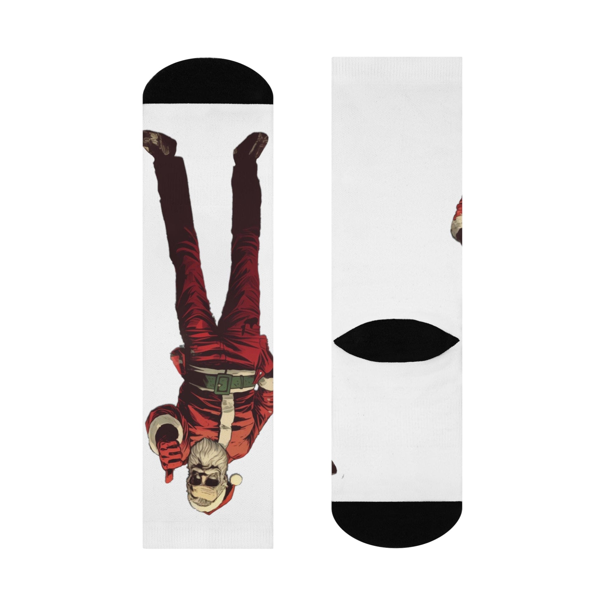 Step into comfort and style with these cushioned crew socks designed for both function and appearance. Made with a blend of materials for a cozy fit, these socks feature cushioned bottoms for superior comfort. The image showcases a modern and stylized Santa Claus giving a thumbs-up gesture, dressed in his traditional attire with a contemporary twist, including sunglasses for added coolness. Perfect for those who want to celebrate the holidays with a touch of modern flair and a positive vibe.