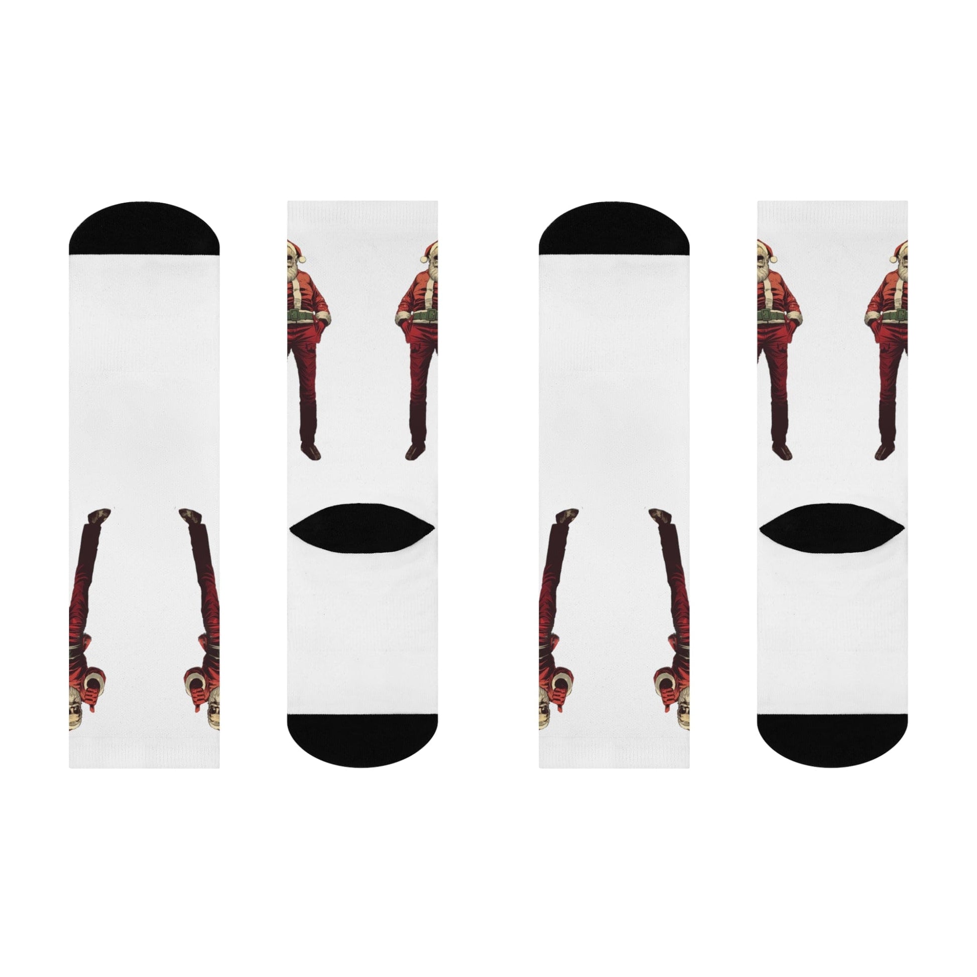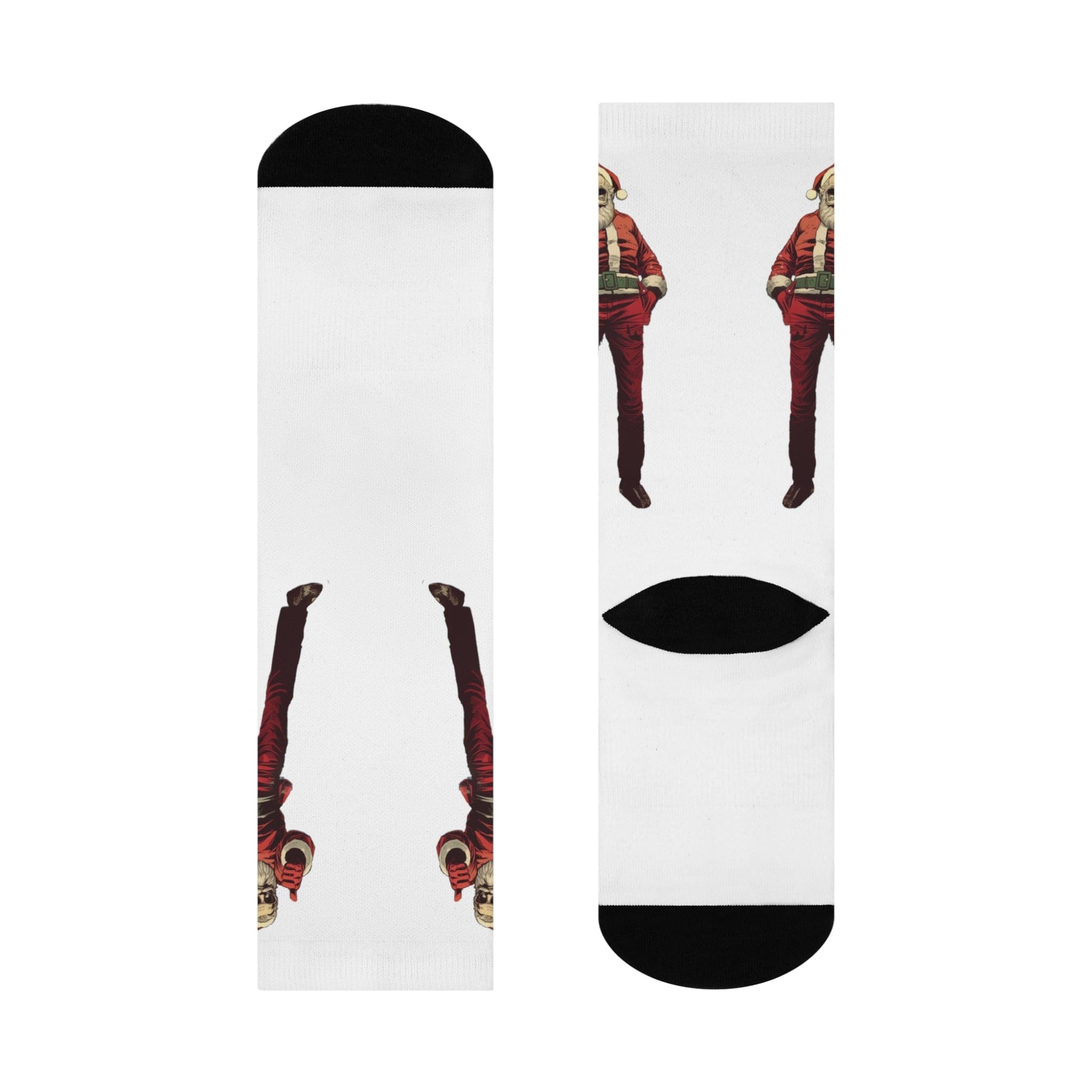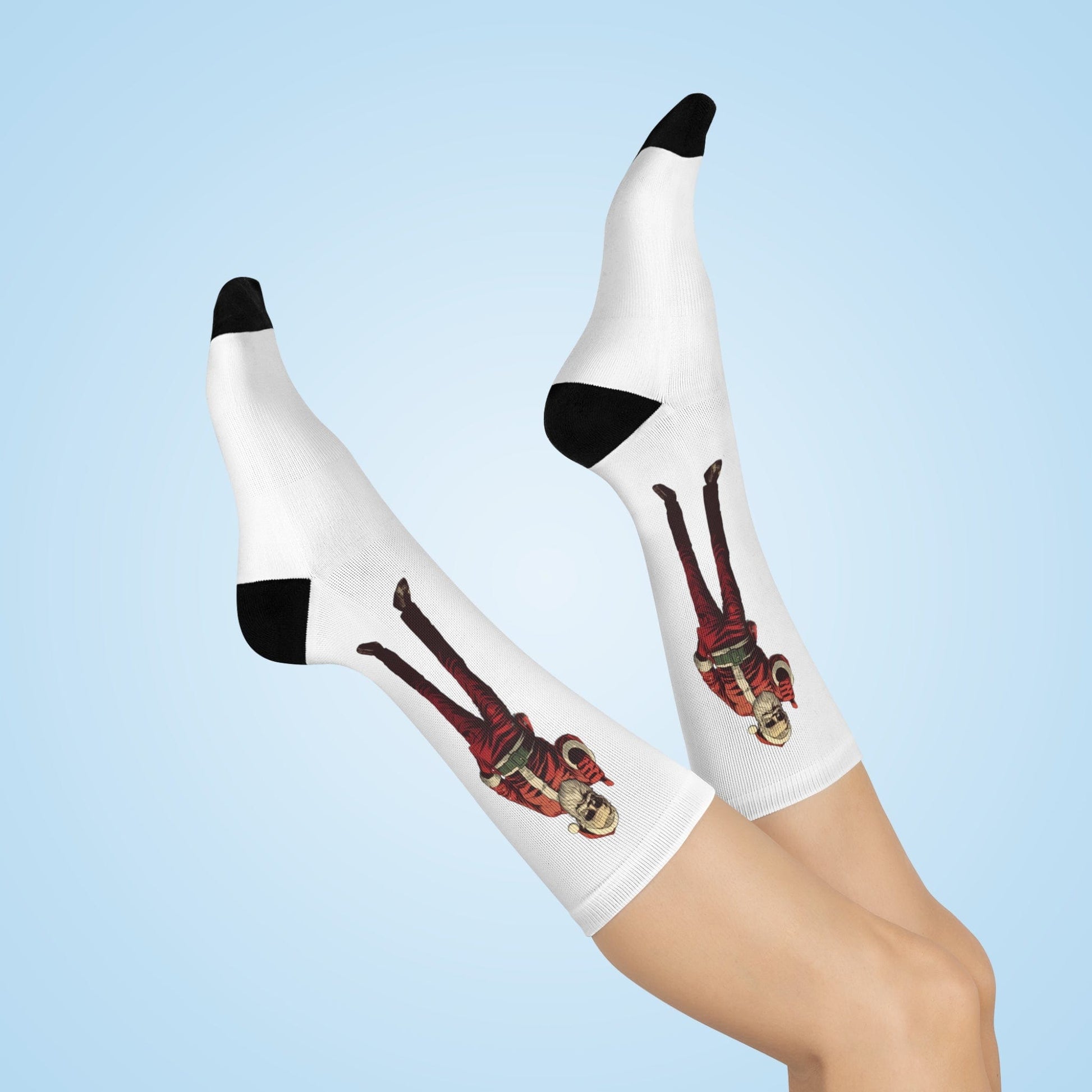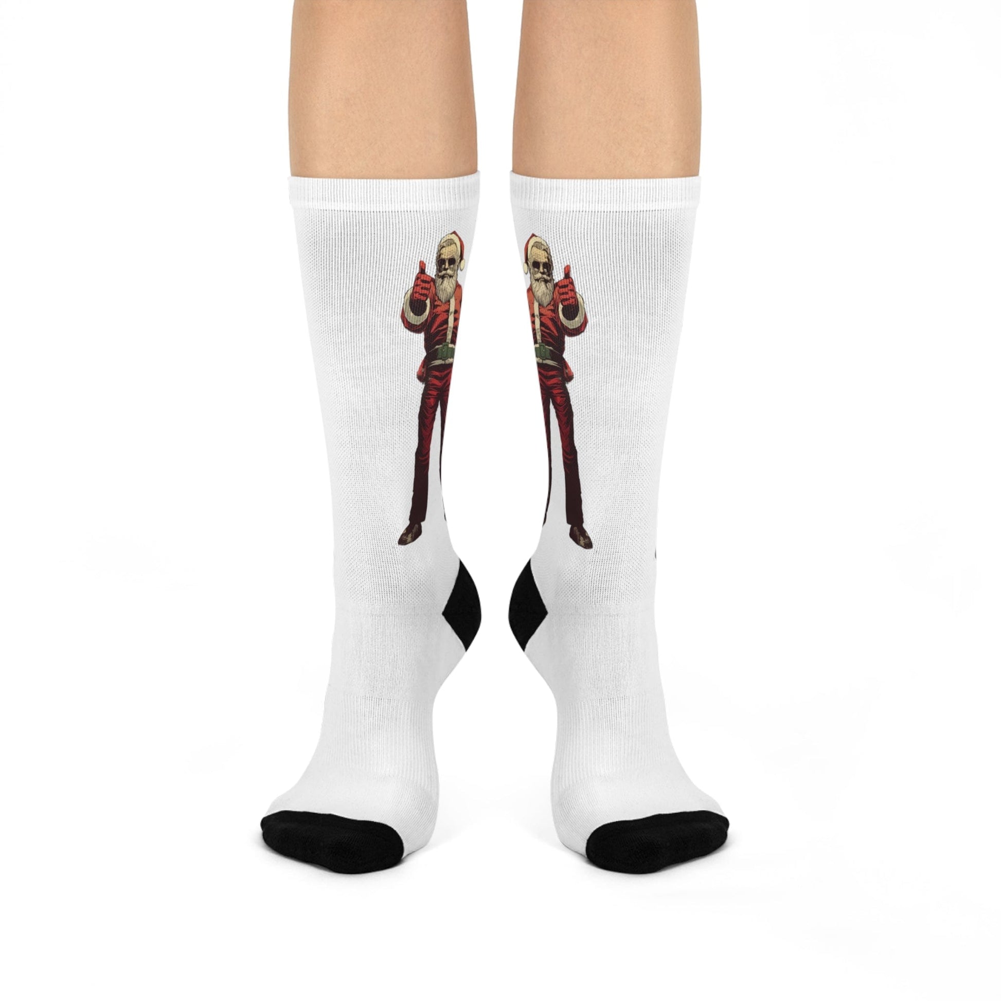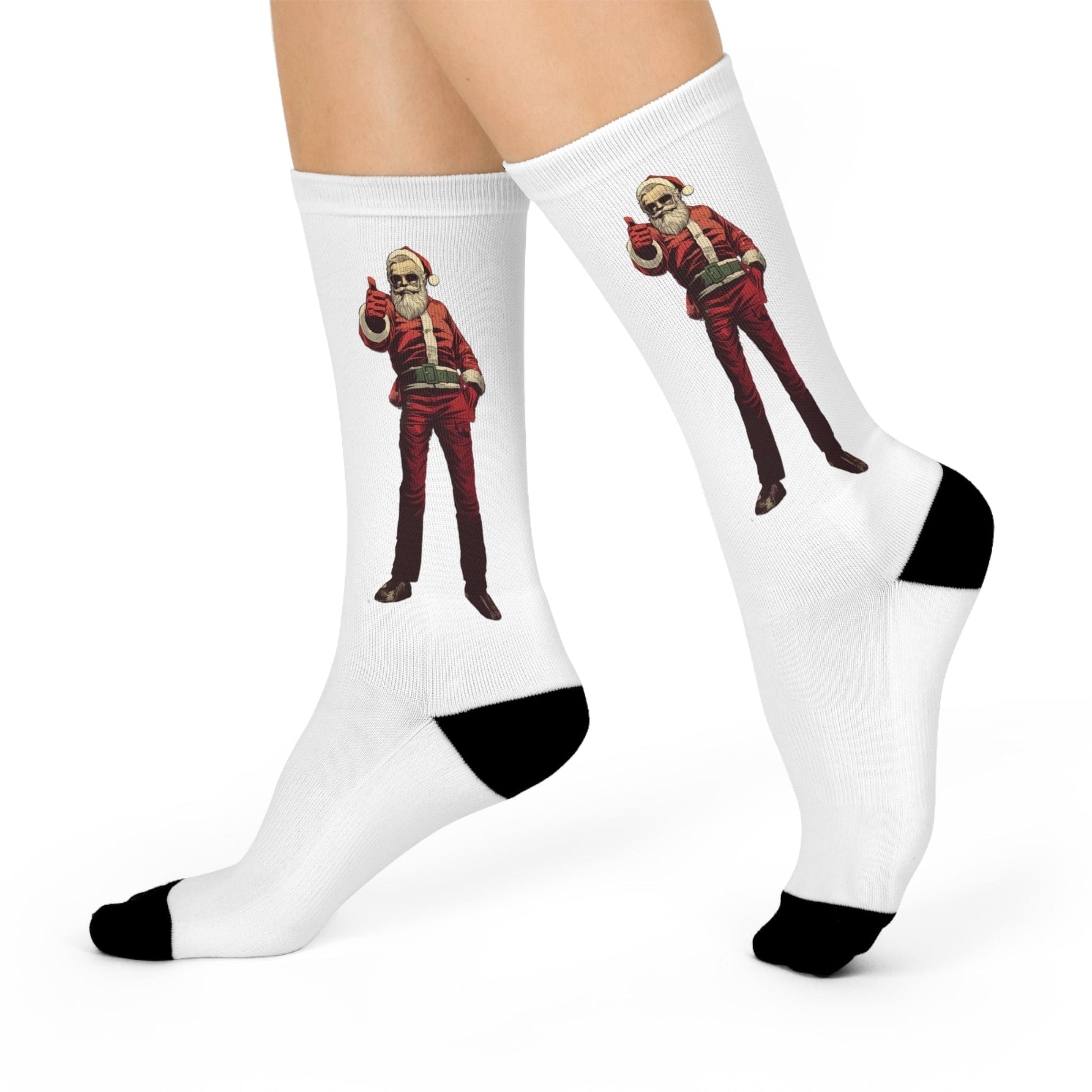 Step into comfort and style with these cushioned crew socks designed for both function and appearance. Made with a blend of materials for a cozy fit, these socks feature cushioned bottoms for superior comfort. The image showcases a modern and stylized Santa Claus giving a thumbs-up gesture, dressed in his traditional attire with a contemporary twist, including sunglasses for added coolness. Perfect for those who want to celebrate the holidays with a touch of modern flair and a positive vibe.