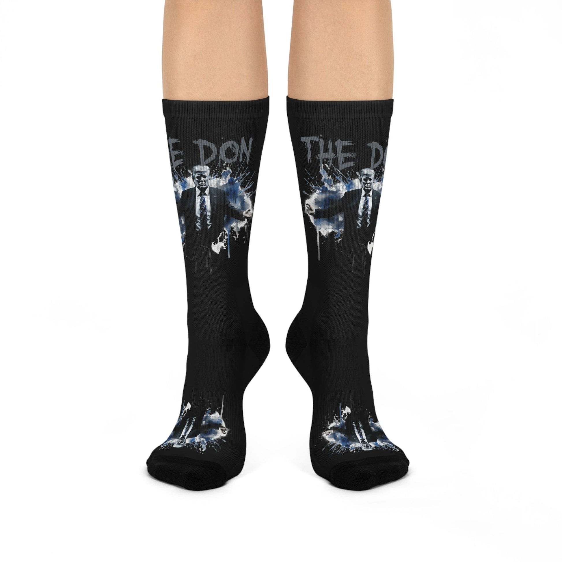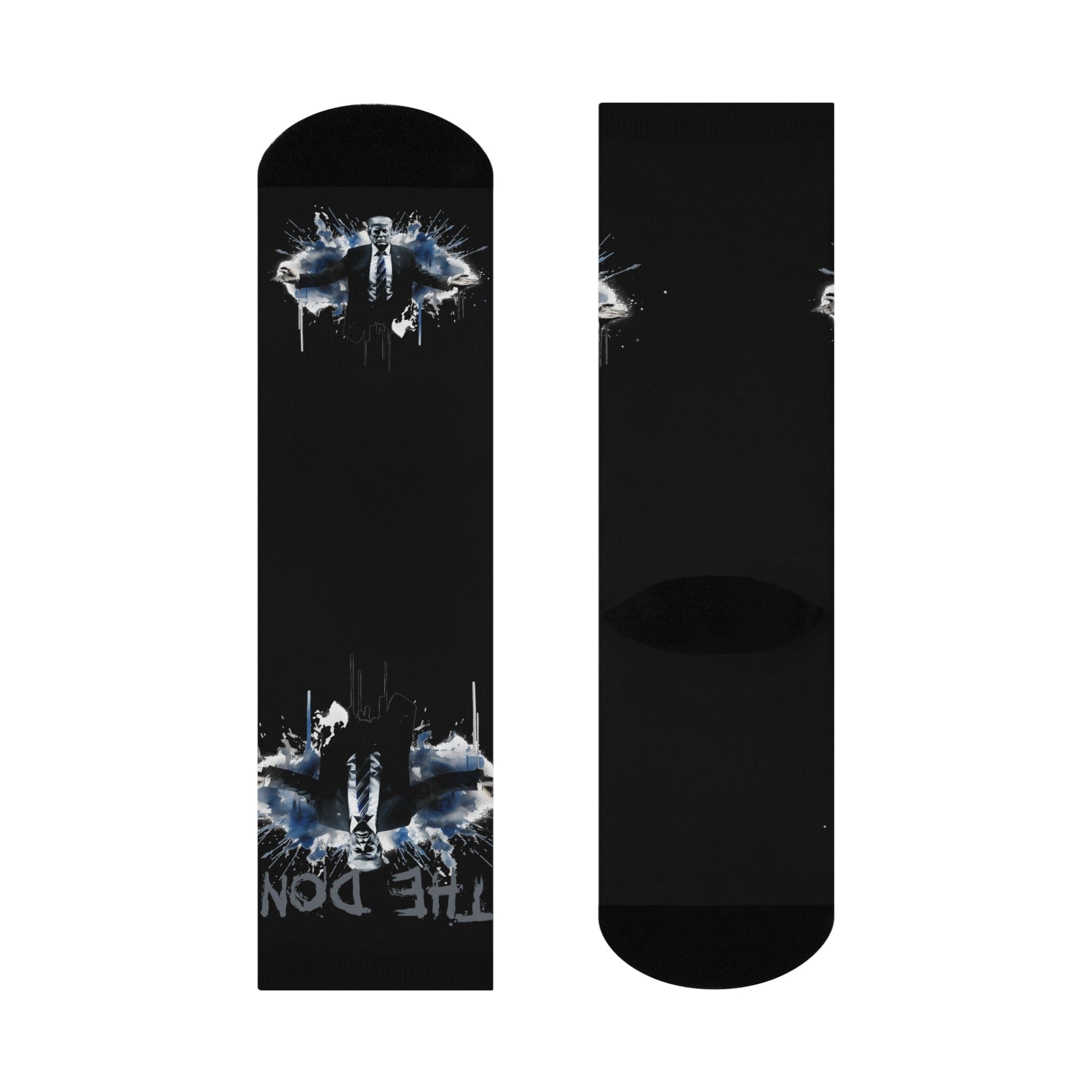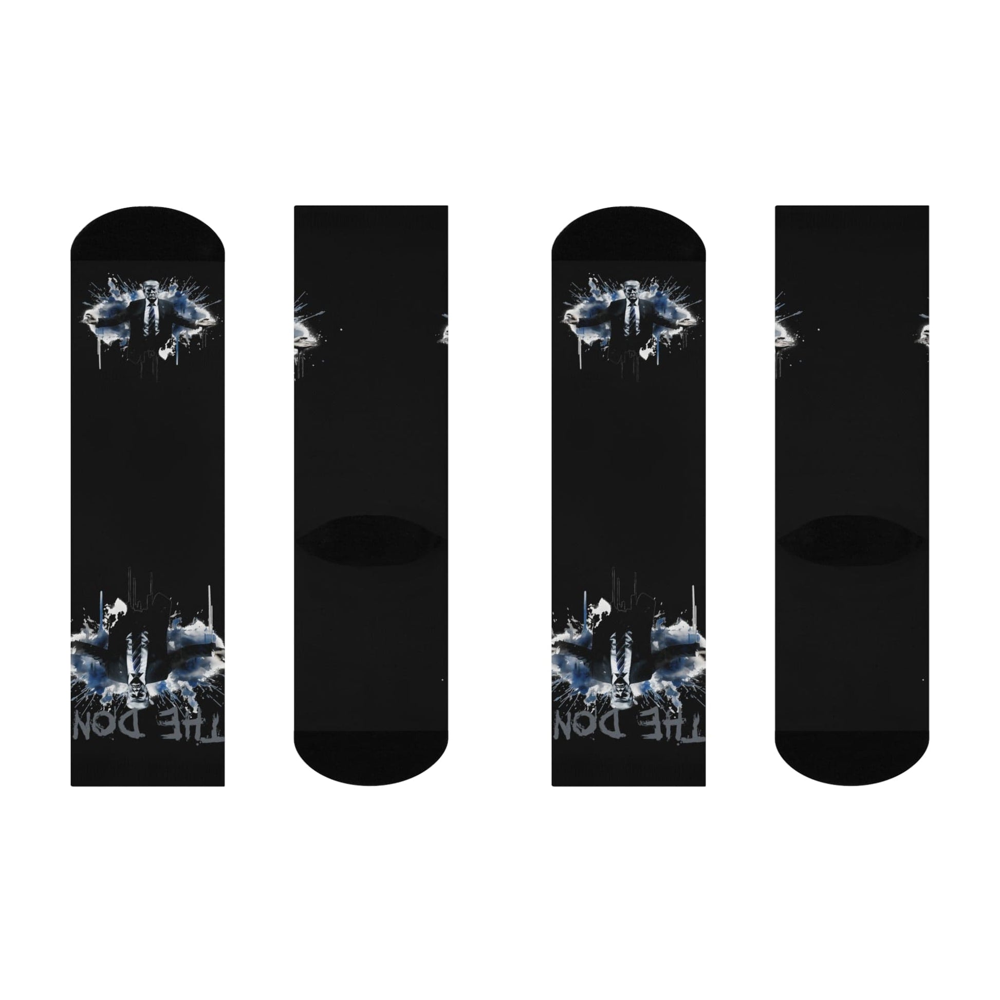 Step into style with The Don Black Cushioned Crew Socks! These one-size-fits-all socks offer comfort and a touch of boldness. Featuring a striking monochromatic portrait of Trump against a dramatic dark blue inkblot backdrop, these socks make a statement. Made with premium materials, they're perfect for anyone looking to add a touch of presidential flair to their attire.